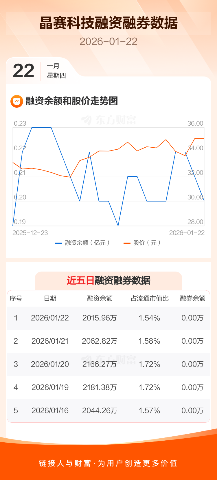交易所最新数据显示,晶赛科技于2026年1月22日获融资买入216.27万元,融资偿还263.12万元,当日融资净偿还46.86万元。目前,该股融资余额2015.96万,占流通市值比例为1.54%。