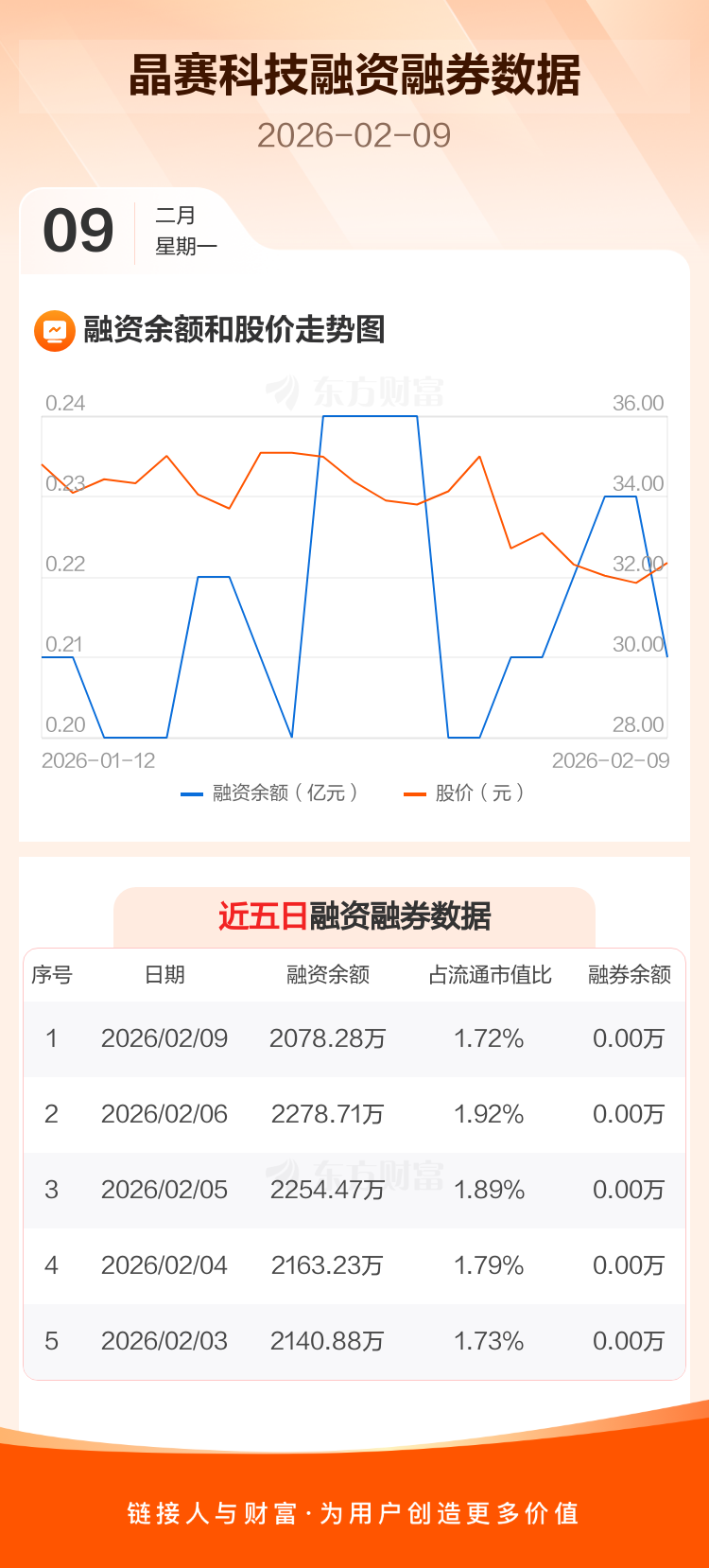 交易所最新数据显示,晶赛科技于2026年2月9日获融资买入101.04万元,融资偿还301.47万元,当日融资净偿还200.43万元。目前,该股融资余额2078.28万,占流通市值比例为1.72%。