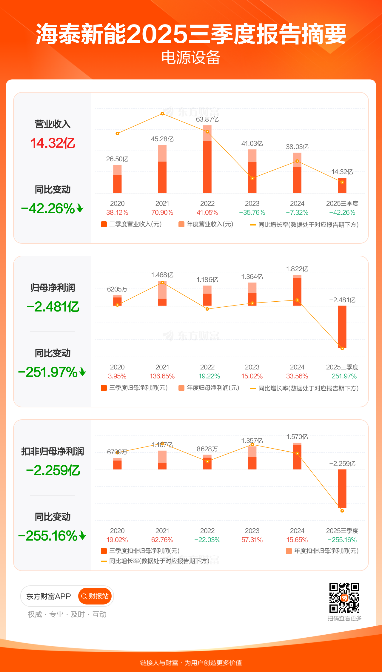海泰新能10月28日发布2025年三季报显示,公司前三季实现营业收入14.32亿元,同比下滑42.26%;归母净利润-2.48亿元;扣非归母净利润-2.26亿元