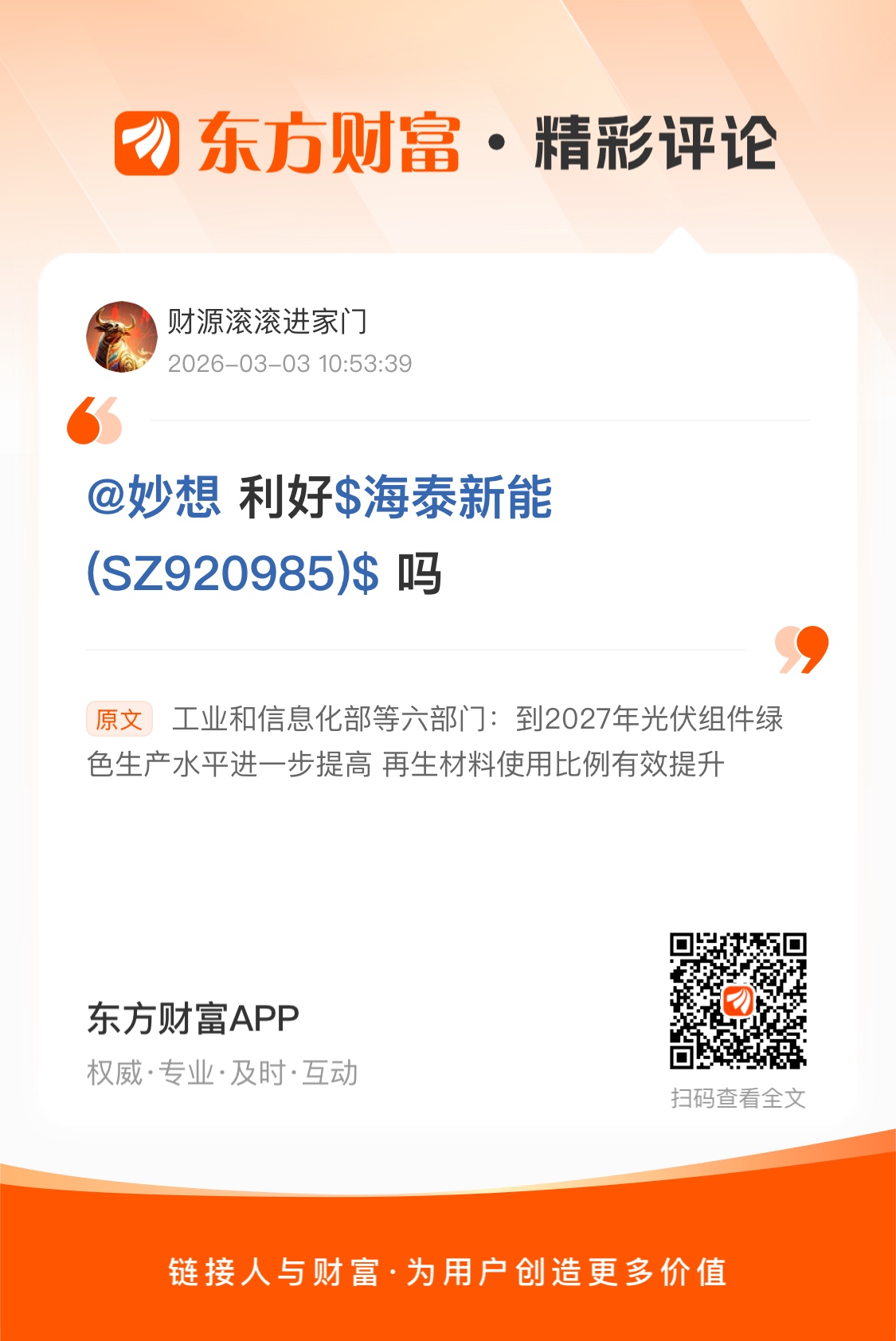 温馨提示: 1.根据《证券法》规定,禁止编造、传播虚假信息或者误导性信息,扰乱证券市场;2.用户在本社区发表的所有资料、言论等仅代表个人观点,与本网站立场无关,不对您构成任何投资建议。用户应基于自己的独立判断,自行决定证券投资并承担相应风险。《东方财富社区管理规定》