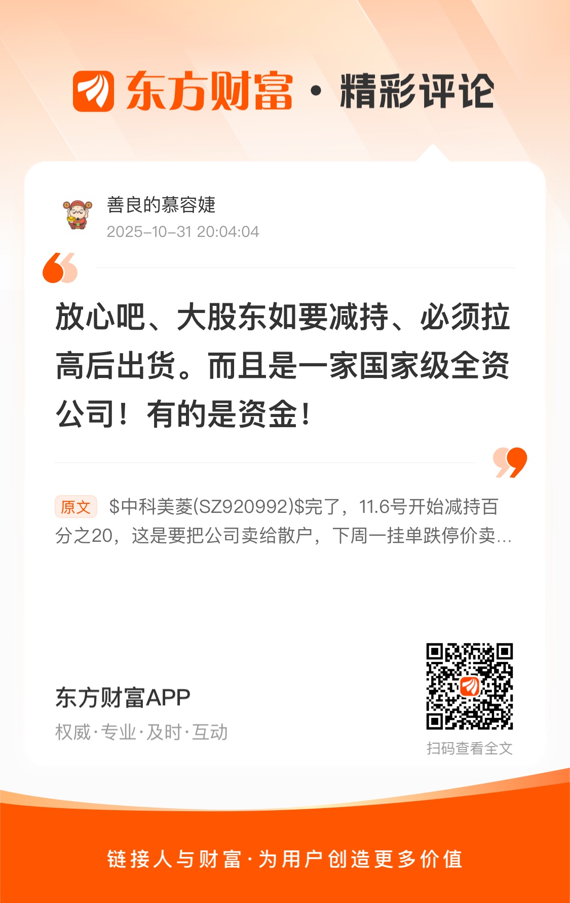 $中科美菱(SZ920992)$  完了,11.6号开始减持百分之20,这是要把公司卖给散户,下周一挂单跌停价卖,不然卖不掉了。