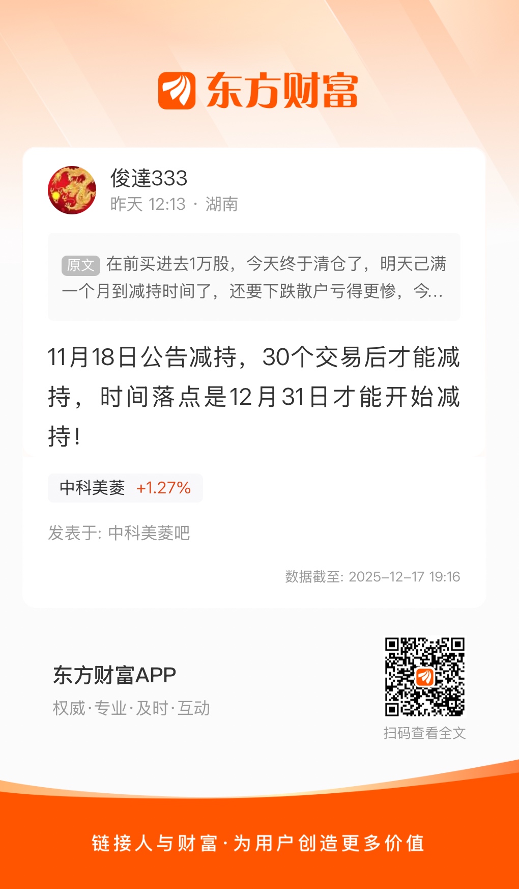 11月18日公告减持,30个交易后才能减持,时间落点是12月31日才能开始减持!