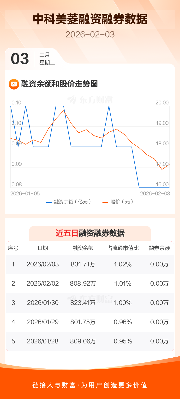 交易所最新数据显示,中科美菱于2026年2月3日获融资买入100.44万元,融资偿还77.65万元,当日融资净买入22.79万元。目前,该股融资余额831.71万,占流通市值比例为1.02%。