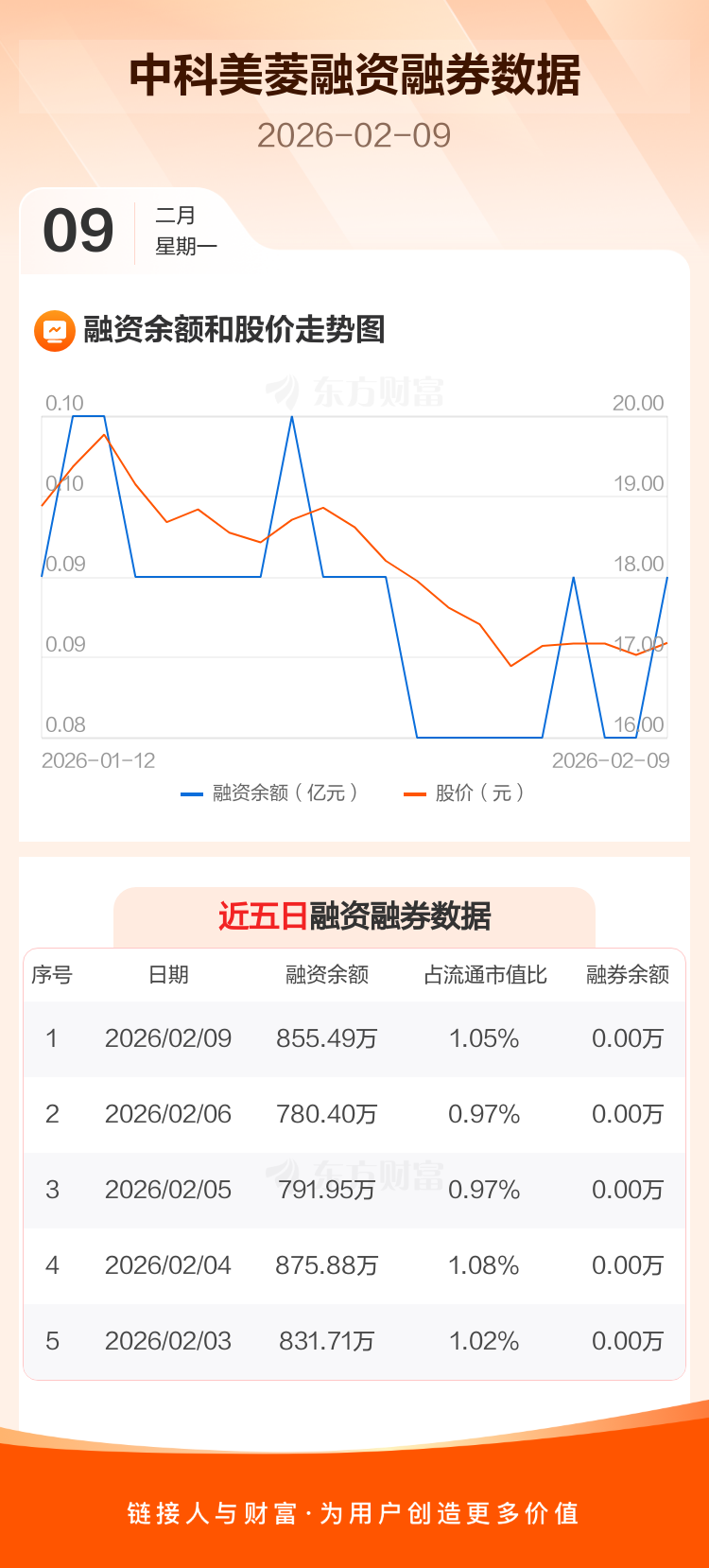 交易所最新数据显示,中科美菱于2026年2月9日获融资买入131.42万元,融资偿还56.33万元,当日融资净买入75.09万元。目前,该股融资余额855.49万,占流通市值比例为1.05%。