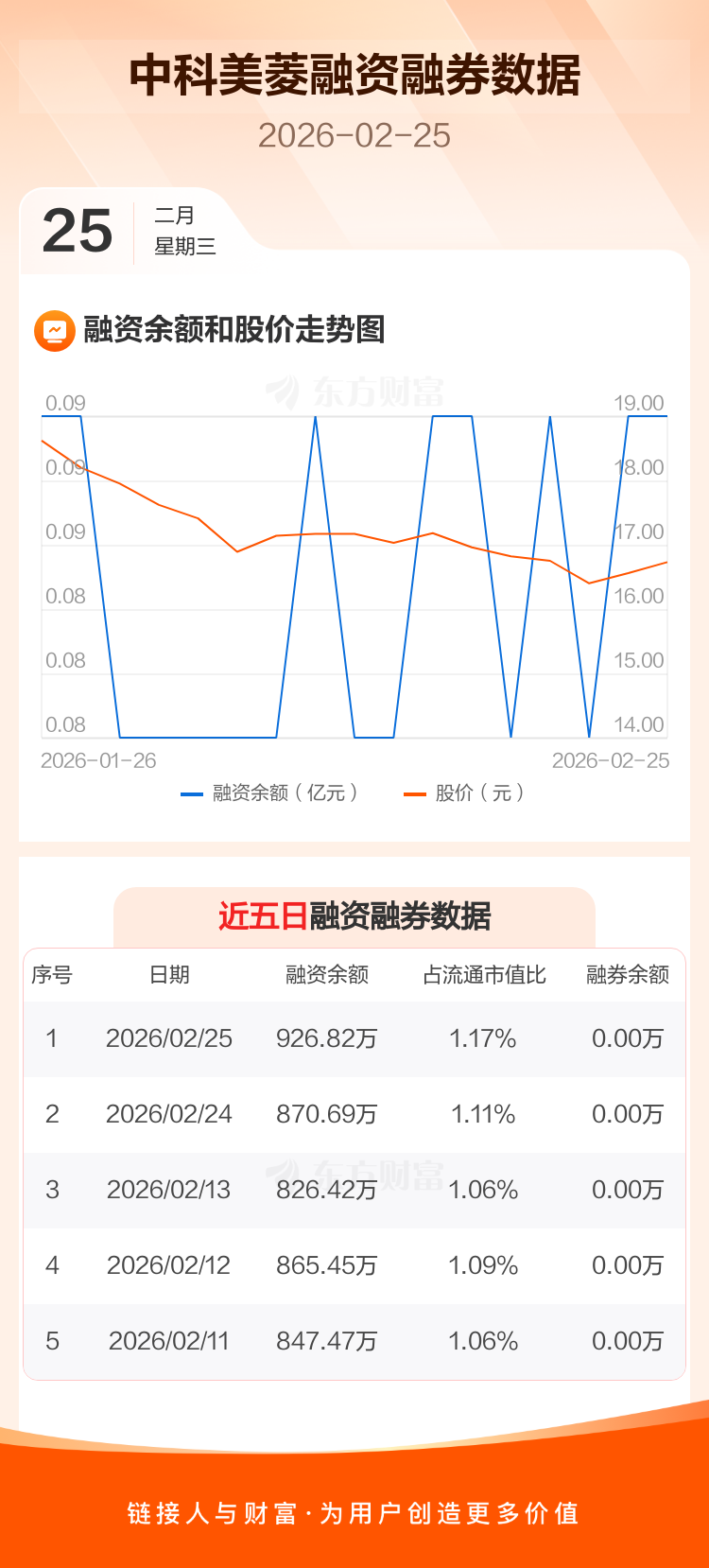 交易所最新数据显示,中科美菱于2026年2月25日获融资买入180.62万元,融资偿还124.49万元,当日融资净买入56.13万元。目前,该股融资余额926.82万,占流通市值比例为1.17%。