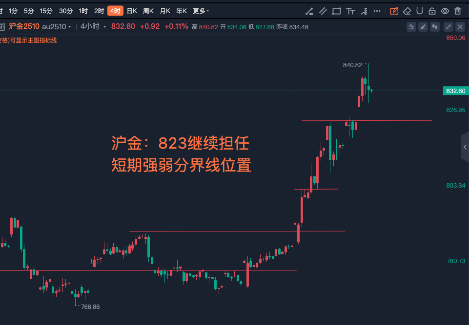 9.10黄金:守住上升趋势线维持多头还是低多,沪金:823继续担任短期强弱分界线位置