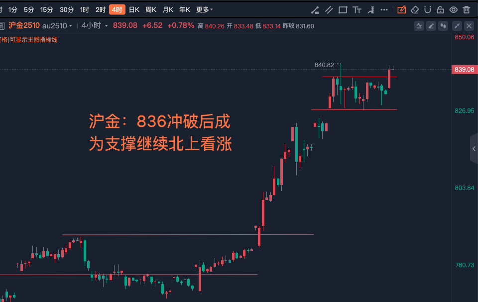 9.16黄金:降息临近金价冲破箱体继续看北上,沪金:836冲破后成为支撑继续北上