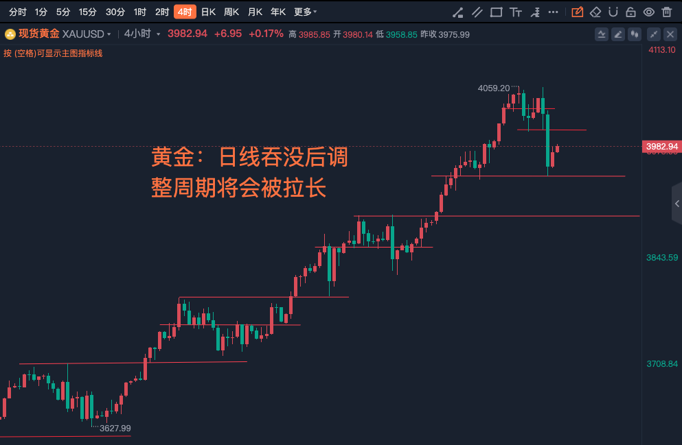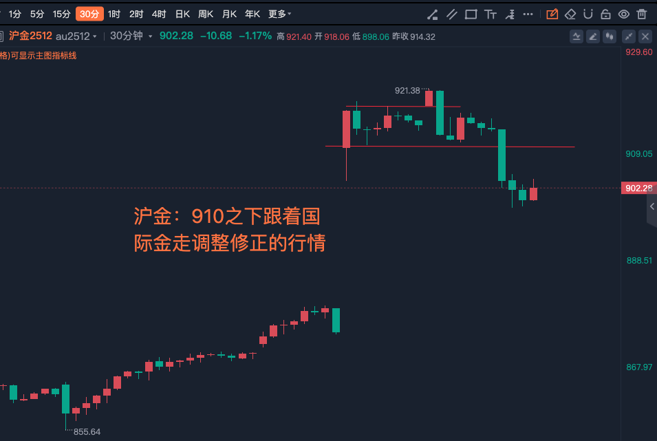黄金:日线吞没后调整周期将会被拉长,沪金:910之下跟着国际金走调整修正的行情