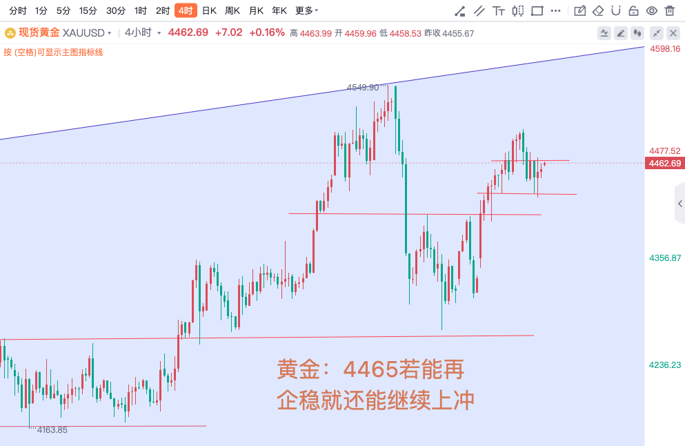黄金:4465若能再企稳就还能继续上冲,沪金:以昨日低点为防守做短线多头布局