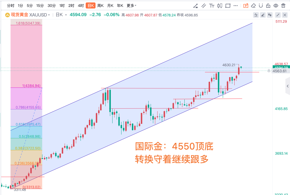 国际金:4550顶底转换守着继续跟多,沪金:守1020前高点支撑跟随国际金北上