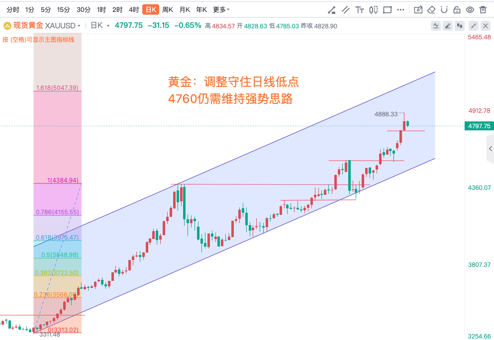 黄金:调整守住日线低点4760仍需维持强势思路,沪金:继续守4h大阳线低点107