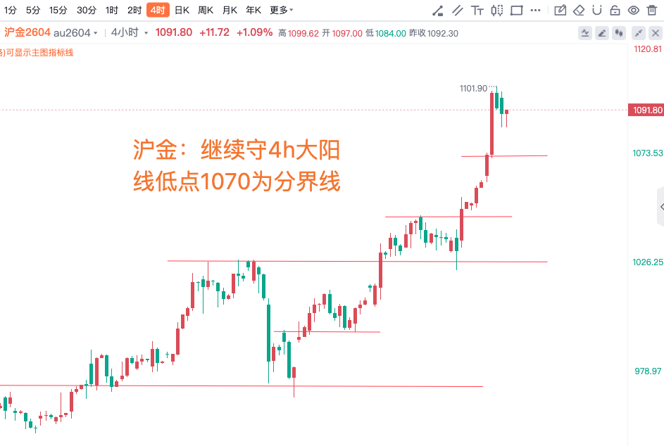 黄金:调整守住日线低点4760仍需维持强势思路,沪金:继续守4h大阳线低点1070为分界线