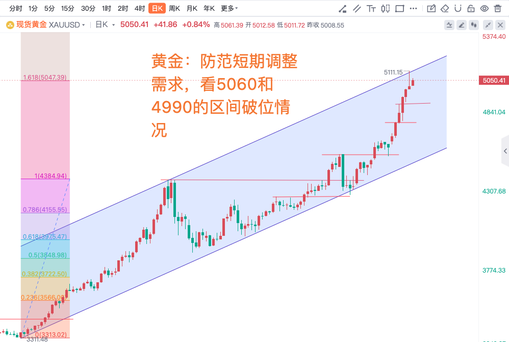 黄金:防范短期调整需求,看5060和4990的区间破位情况,沪金:1138就是短期多头的关键防守线