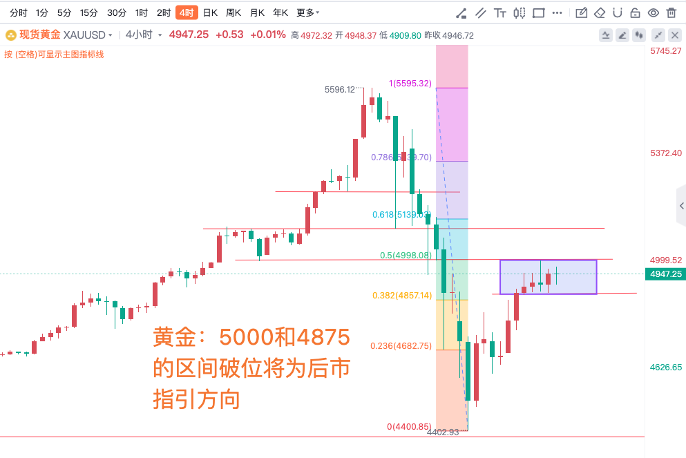 黄金:5000和4875的区间破位将为后市指引方向,沪金:1100之上还看113