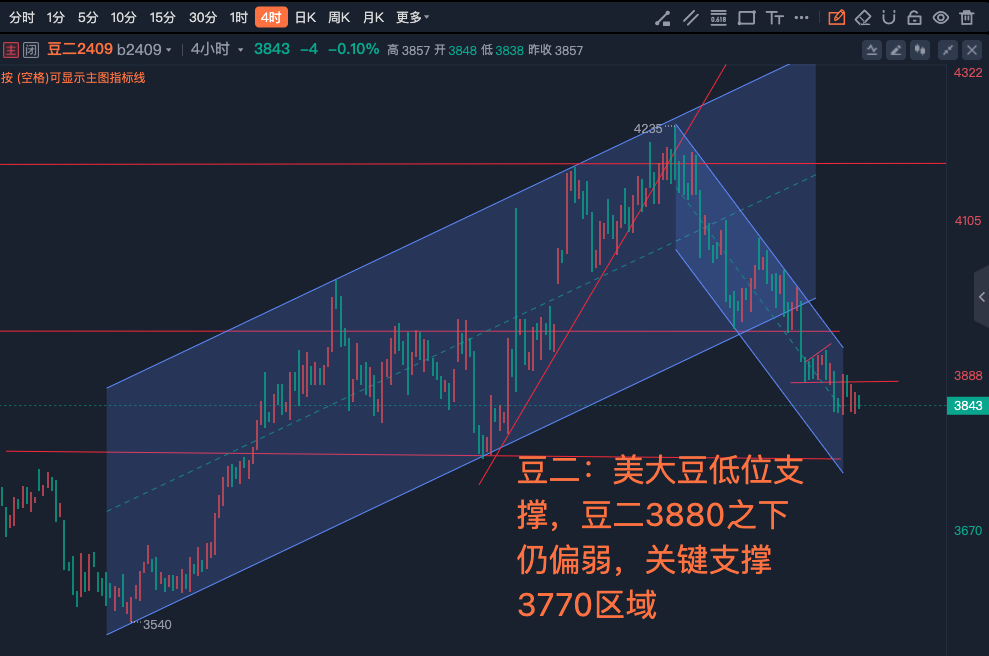 豆二:美大豆低位支撑,豆二3880之下仍偏弱,关键支撑3770区域