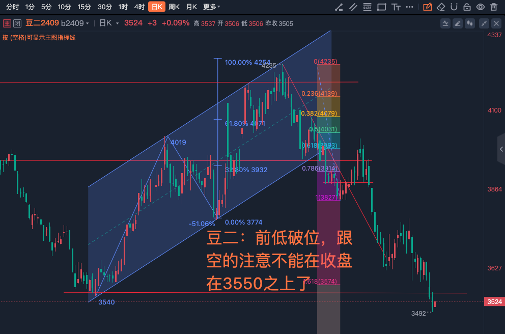 豆二:前低破位,跟空的注意不能在收盘在3550之上了