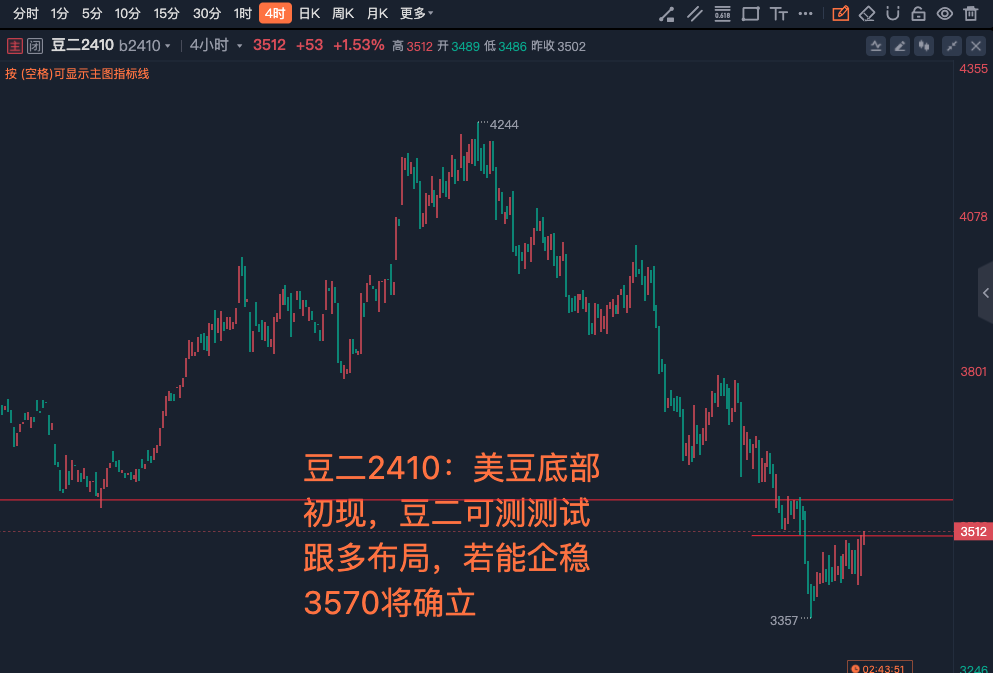 豆二2410:美豆底部初现,豆二可测测试跟多布局,若能企稳3570将确立