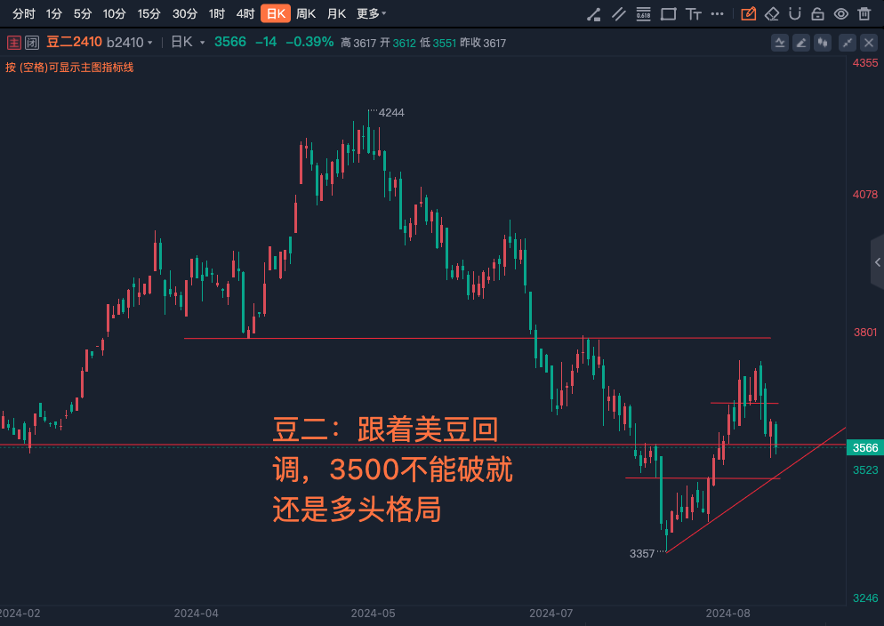 豆二:跟着美豆回调,3500不能破就还是多头格局