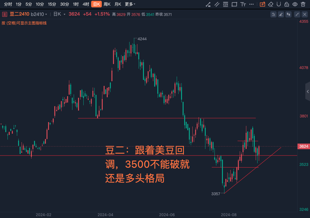 豆二:跟着美豆回调,3500不能破就还是多头格局