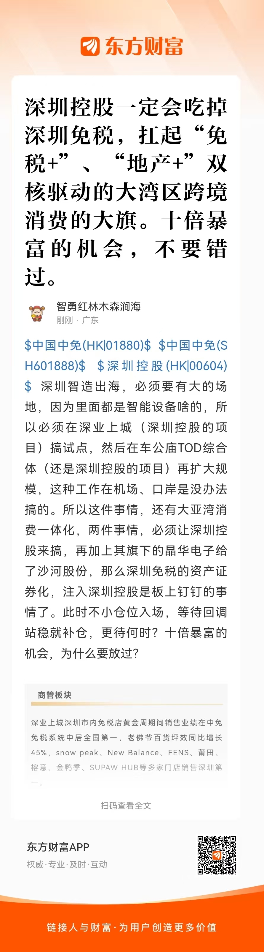 $海南板块(BK0176)$ $深圳控股(HK|00604)$ 深圳控股一定会吃掉深圳免税,扛起“免税+”、“地产+”双核驱动的大湾区跨境消费的大旗。十倍暴富的机会,不要错过。#海南板块持续狂飙!离岛免税新政实施#