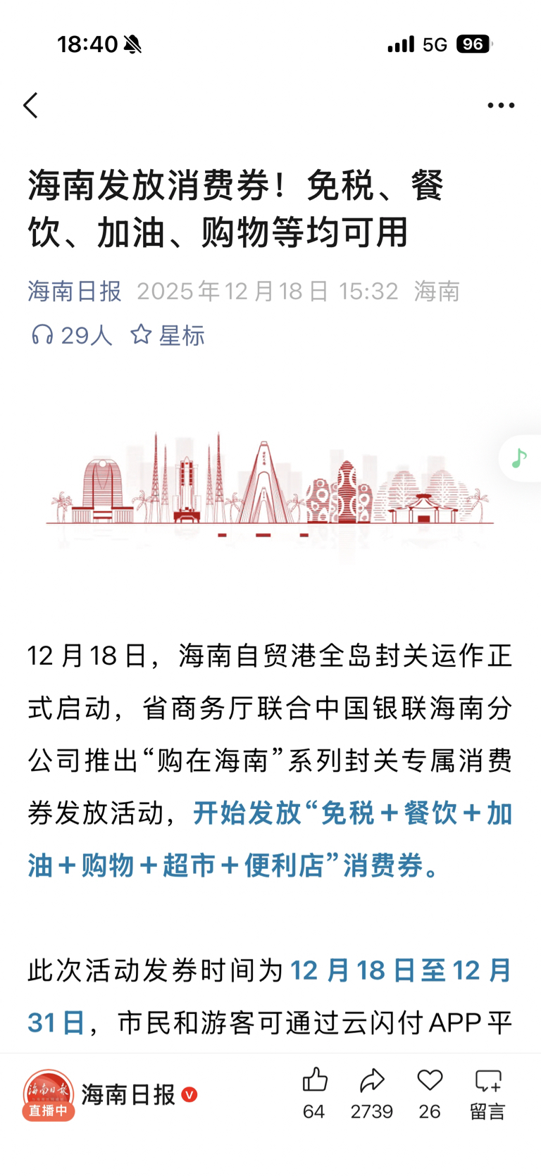 $海南板块(BK0176)$ 海南发放消费券!免税、餐饮、加油、购物等均可!第一波封关福利活动开启!