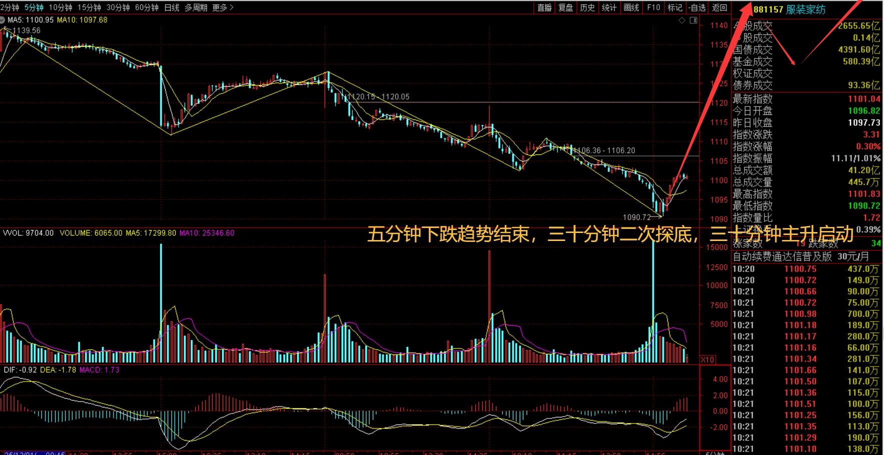 $纺织服装(BK0436)$ $地素时尚(SH603587)$ 服装板块五分钟买点出现,三十分钟二次探底,120分钟上涨趋势的三浪三启动,布局好时机