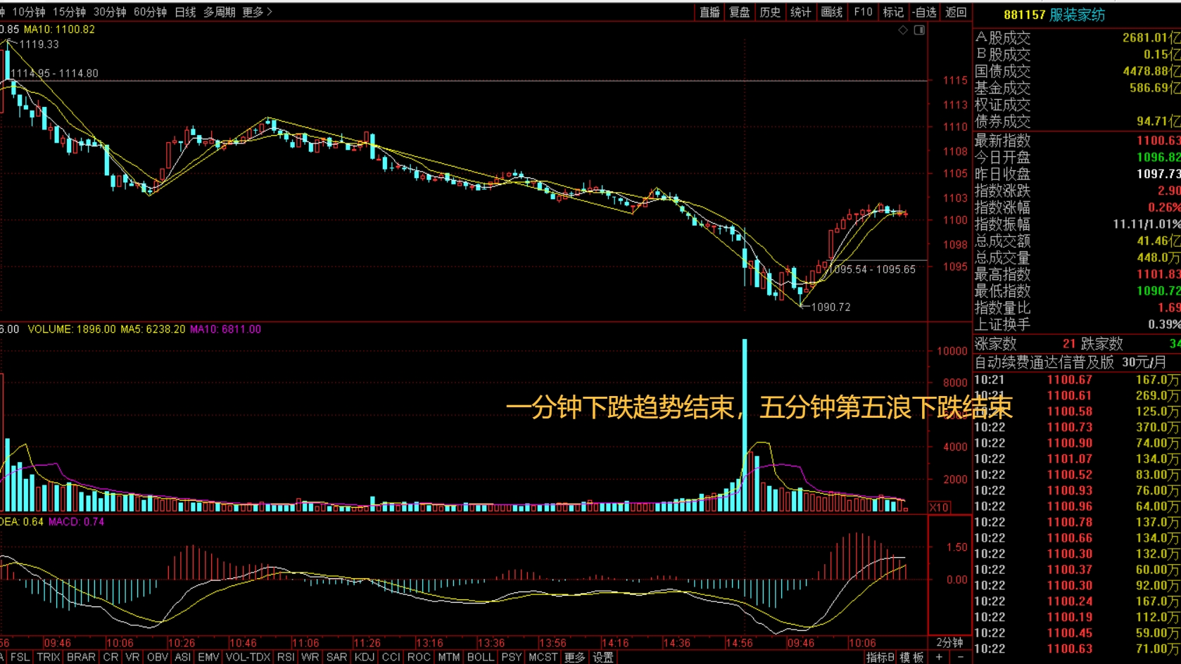服装板块五分钟买点出现,三十分钟二次探底,120分钟上涨趋势的三浪三启动,布局好