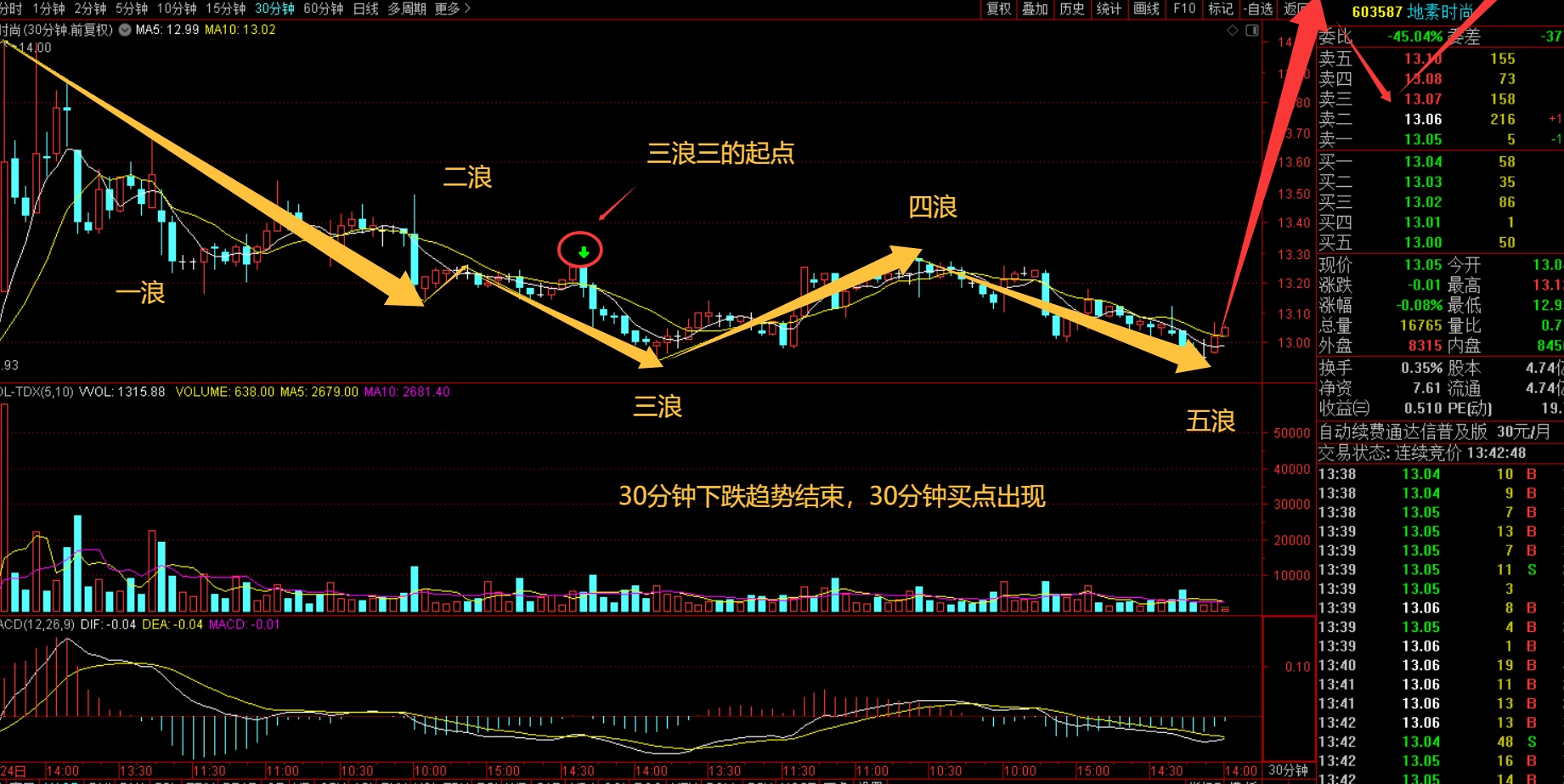 服装板块地素周线第五浪,地素时尚三十分钟买点出现,服装板块开始极速拉升,服装板块