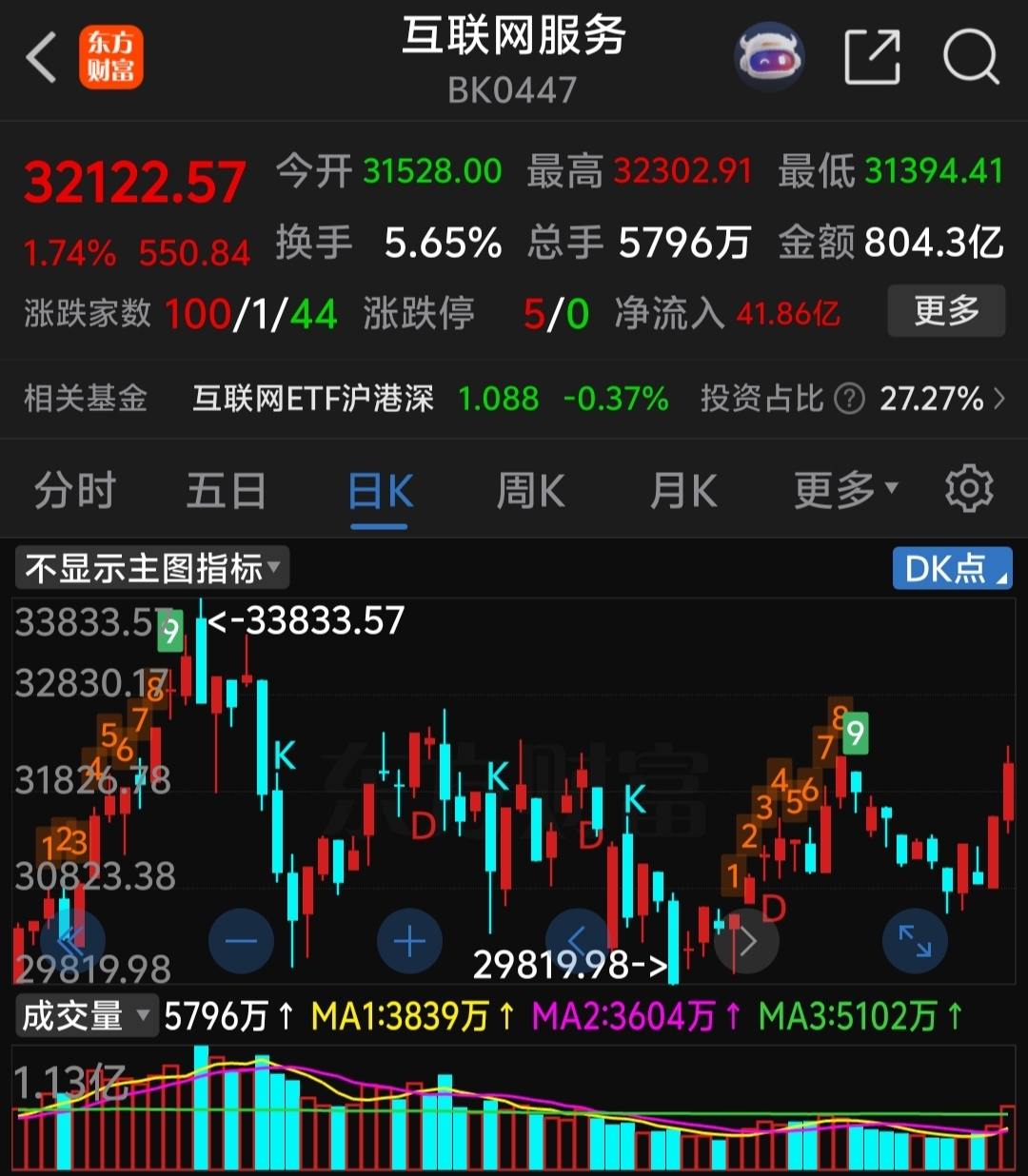 互联网板块连续两天上涨,明天上涨1.5%就会打到阻力,不排除周四有日线级别的小调