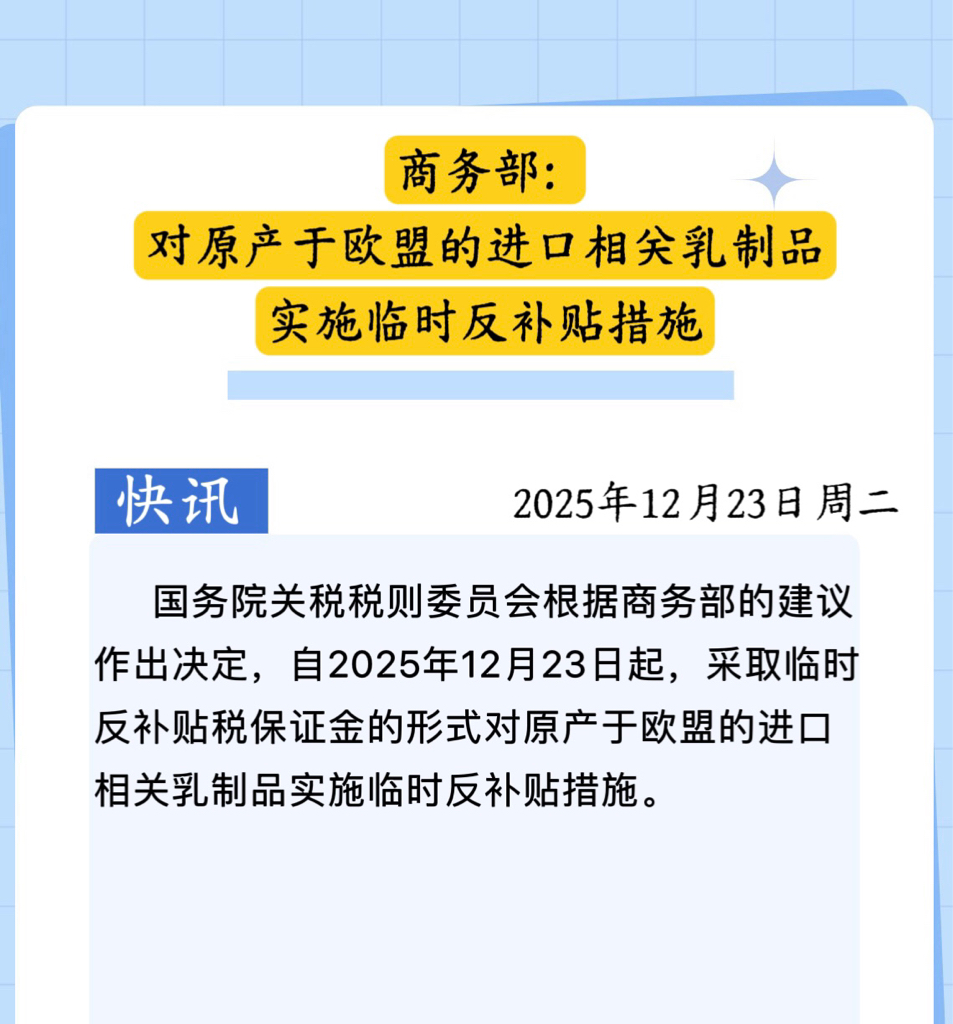 商务部:对原产于欧盟的进口相关乳制品实施临时反补贴措施