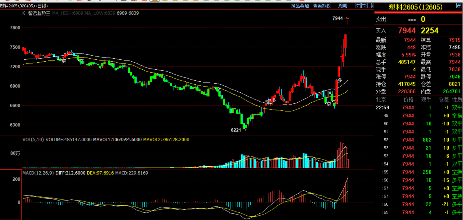 塑料2605涨停,最近和原油化工有关的都是疯涨,一切都是在K线显化出来,红色K线多头区域,绿色K线空头区域,白色线属于多头阵地,黄色线属于空头阵地!期货交易技术要简单,简单的一眼看出行情涨跌!