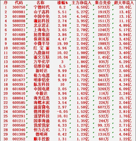 1月20日开盘45分钟,主力资金“买入的”的30名单一览!宁德时代:净流入6.5