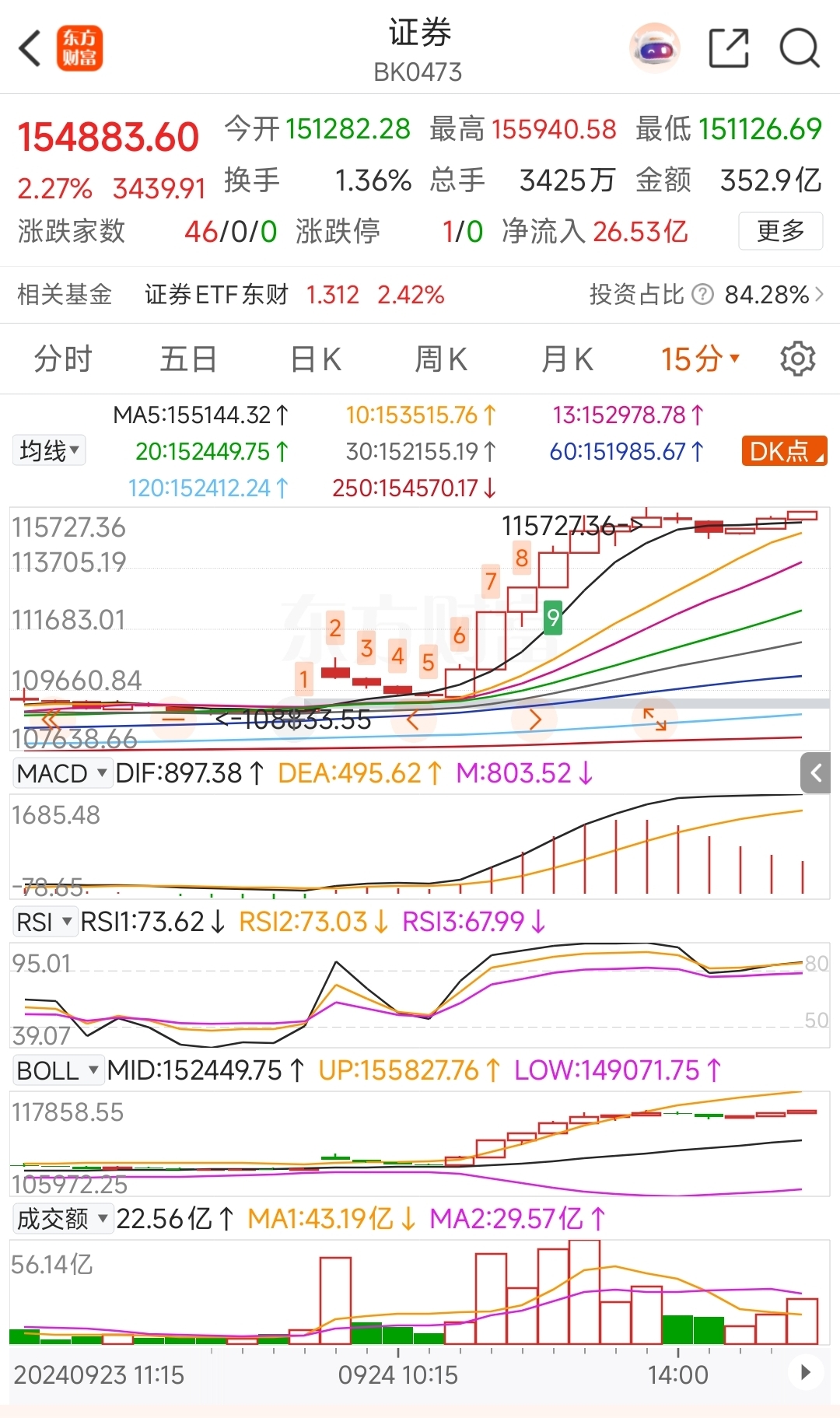 我这里放了一张924的15分钟图,如果你担心追高,出现高开低走回落,等那个6那样的位置出来再买也来得及,那个就是一个确认,确认不会回到923的位置。