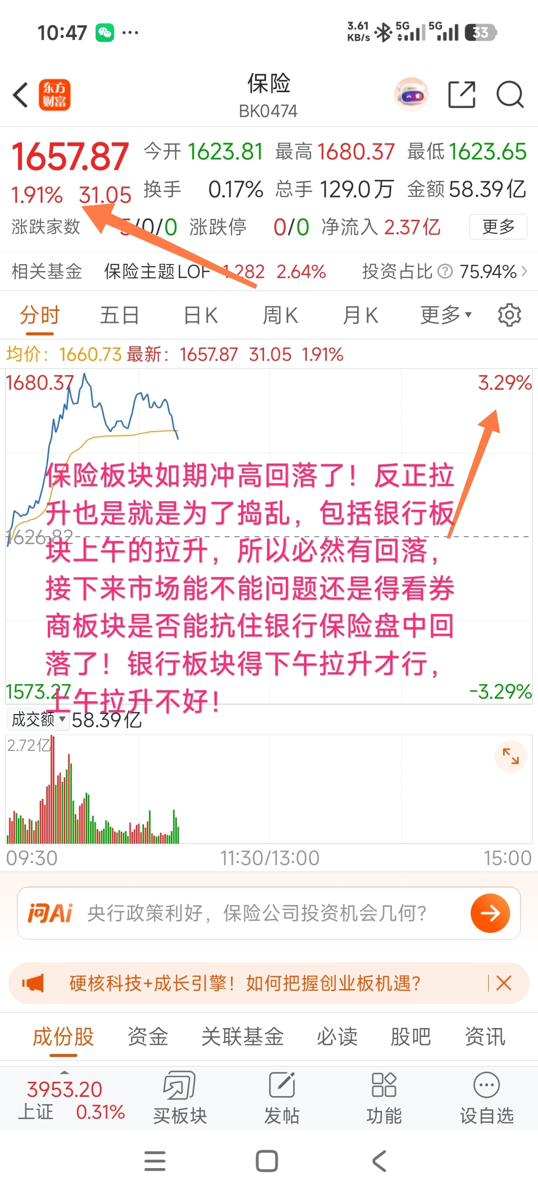 $保险(BK0474)$ $上证指数(SH000001)$ $东方财富(SZ300059)$ 保险板块如期冲高回落了!反正拉升也是就是为了捣乱,包括银行板块上午的拉升,所以必然有回落,接下来市场能不能问题还是得看券商板块是否能抗住银行保险盘中回落了!银行板块得下午拉升才行,上午拉升不好!