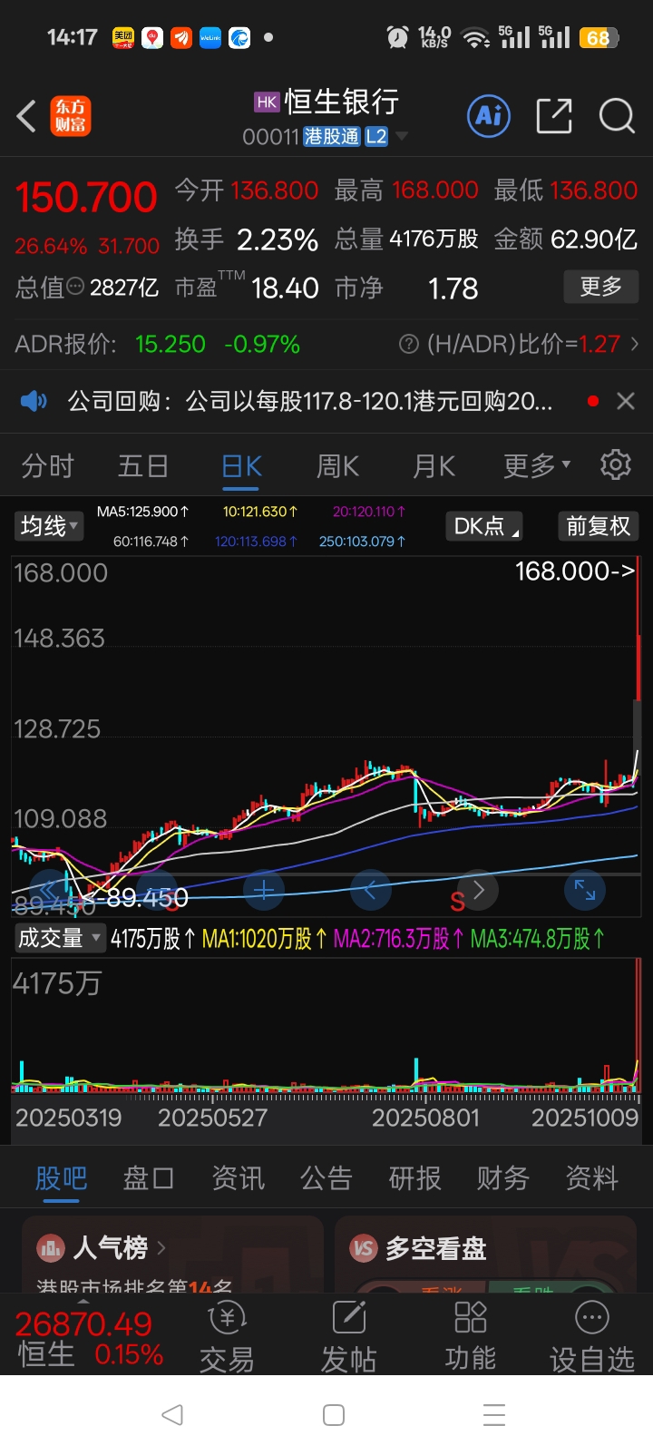 国庆节过后,恒生银行今天10月9日大涨26%!