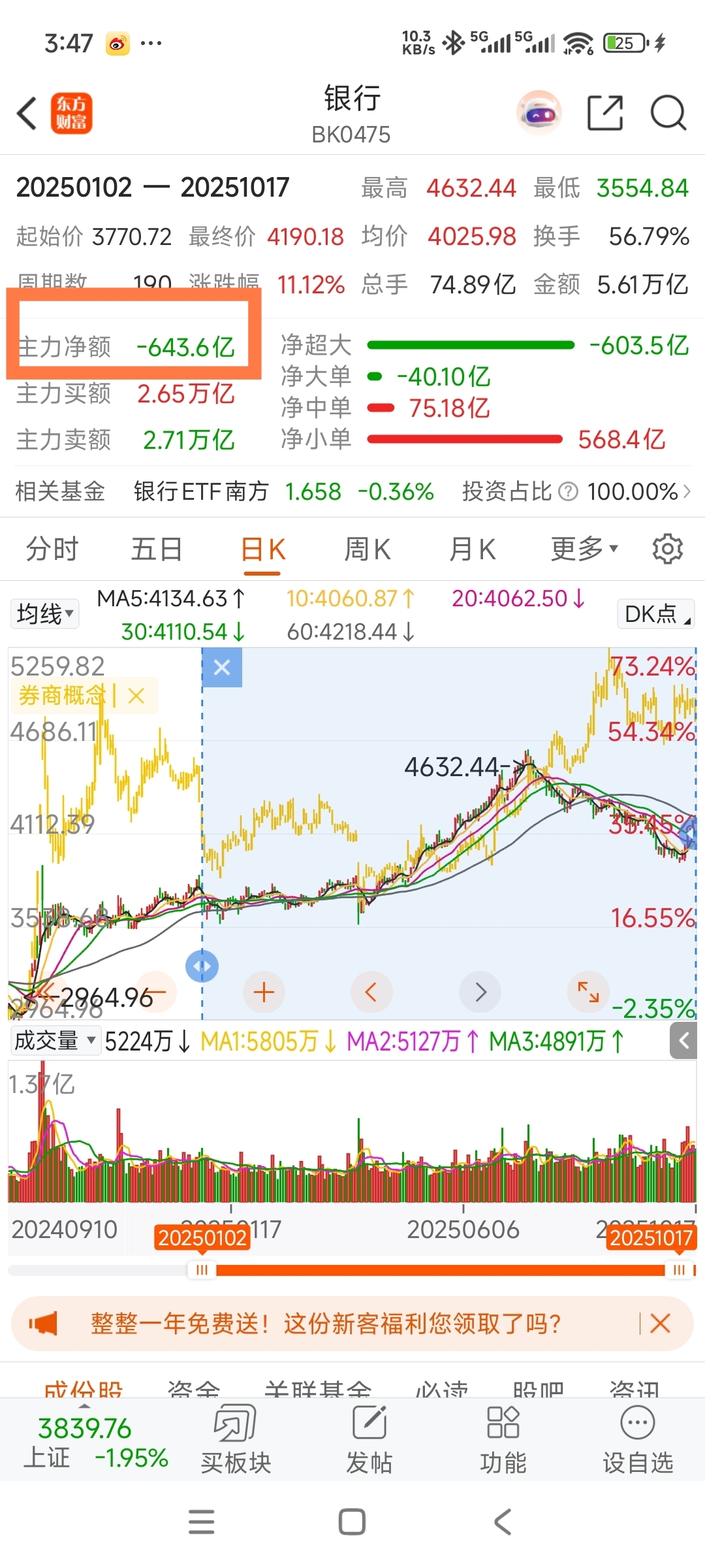 $银行(BK0475)$ $上证指数(SH000001)$ $东方财富(SZ300059)$ 汇金主力把白花花的银子买银行,能套现多少,能获利多少,一切都是账面价值,敢轻易减持吗?自保而已!不过折磨市场是真的!