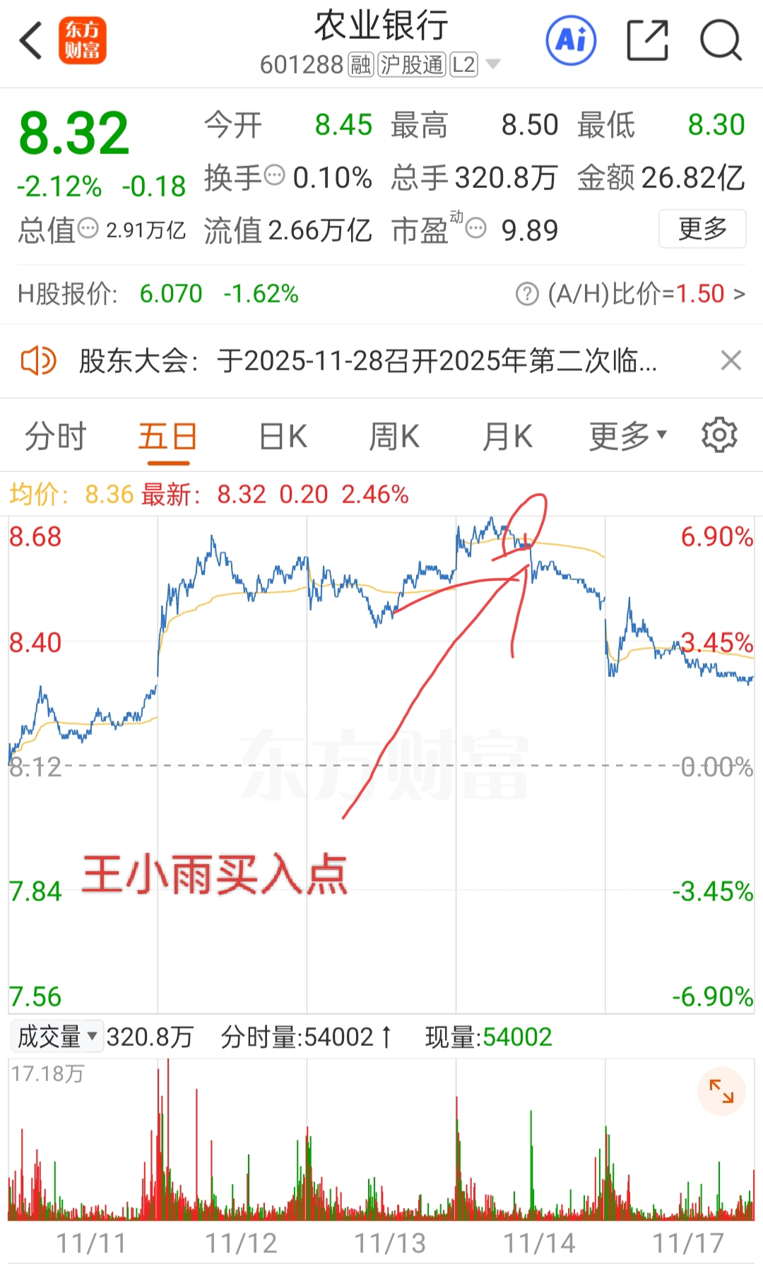 你就说牛不牛,她上周五进的下一秒农业银行直线向下两个点,两天蒸发一千六百亿市值