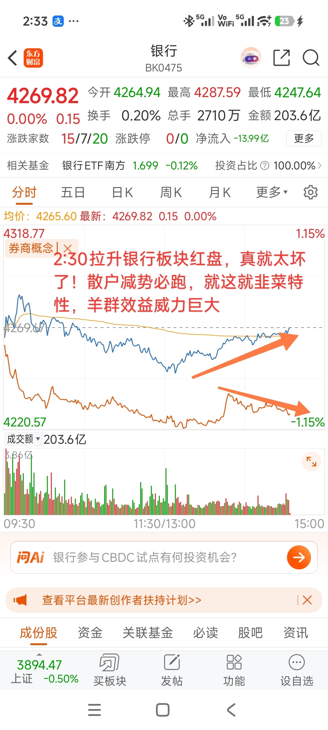 2:30拉升银行板块红盘,真就太坏了!散户减势必跑,就这就韭菜特性,羊群效益威力