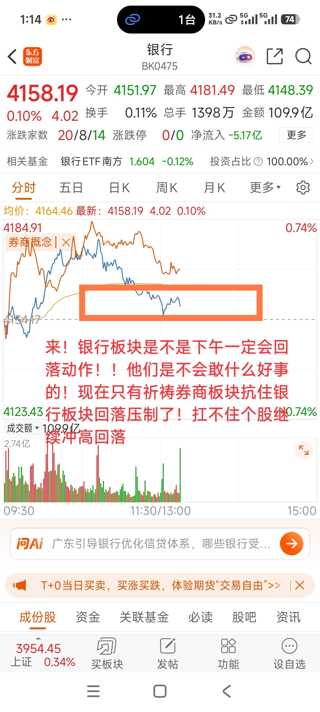 $银行(BK0475)$ $东方财富(SZ300059)$ $上证指数(SH000001)$ 来!银行板块是不是下午一定会回落动作!!他们是不会敢什么好事的!现在只有祈祷券商板块抗住银行板块回落压制了!扛不住个股继续冲高回落
