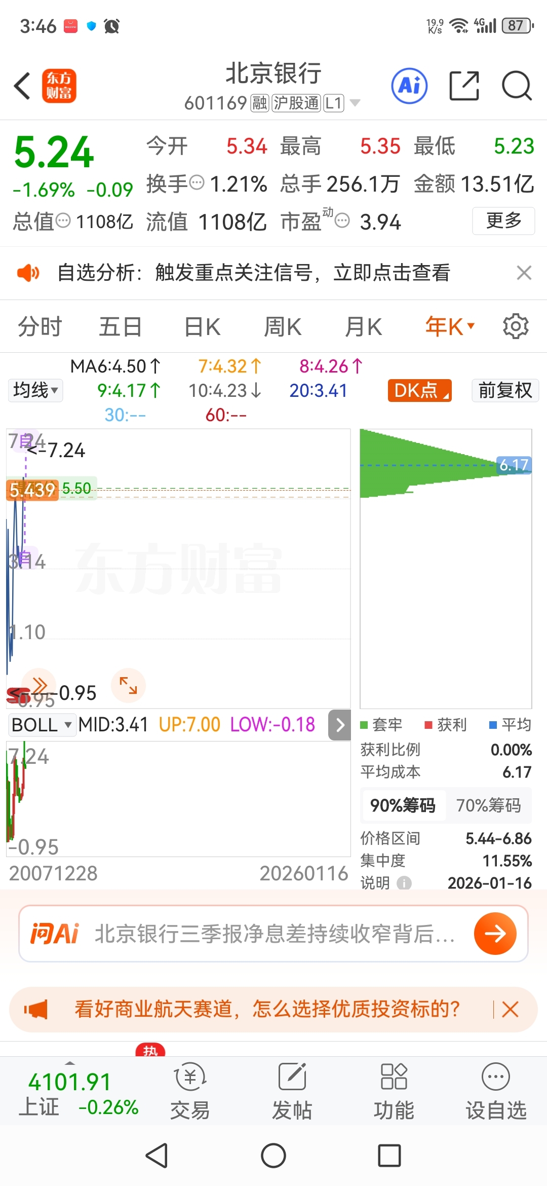 北京银行市盈率3.94,年筹码峰获利为0,北京银行都能砸这样,让股民心凉!