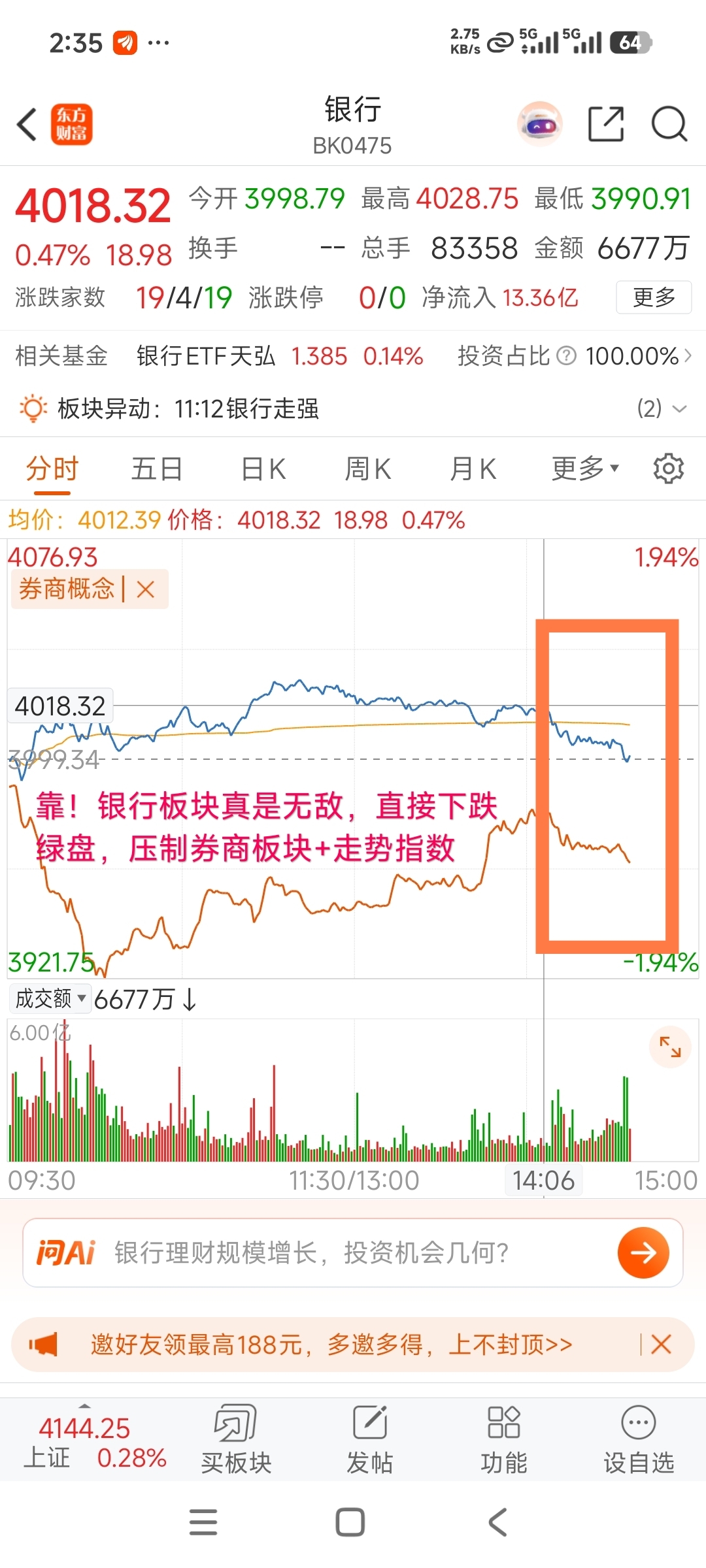 !银行板块真是无敌,直接下跌绿盘,压制券商板块+走势指数