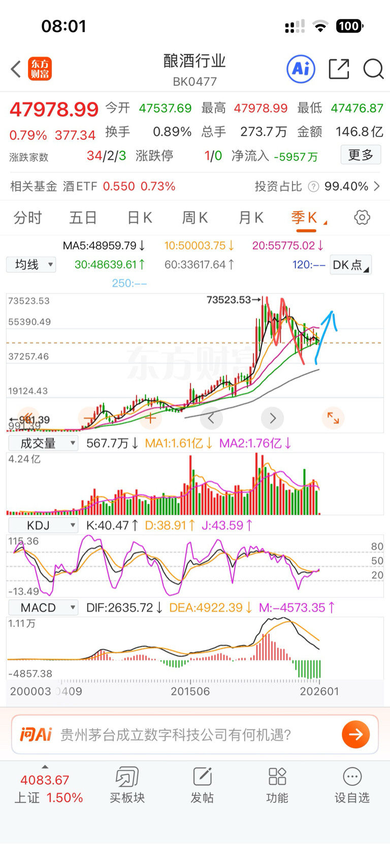 以下两种走势无论哪一种,2026年酿酒板块始终都会有蓝色线上涨的一笔