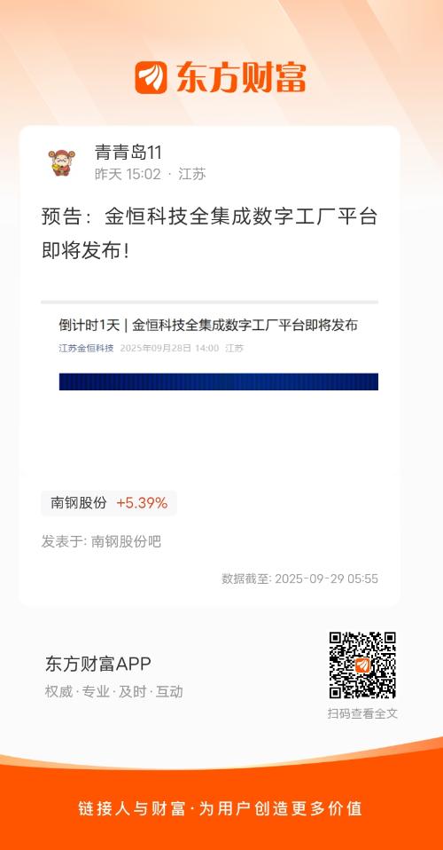 南钢:重磅预告,金恒科技全集成数字工厂平台即将发布!$钢铁行业(BI0479)$$船舶制造(BI0729)$$沪深300ETF(SH510300)$