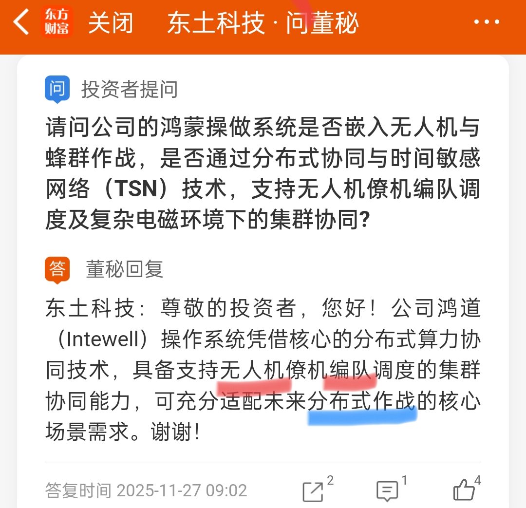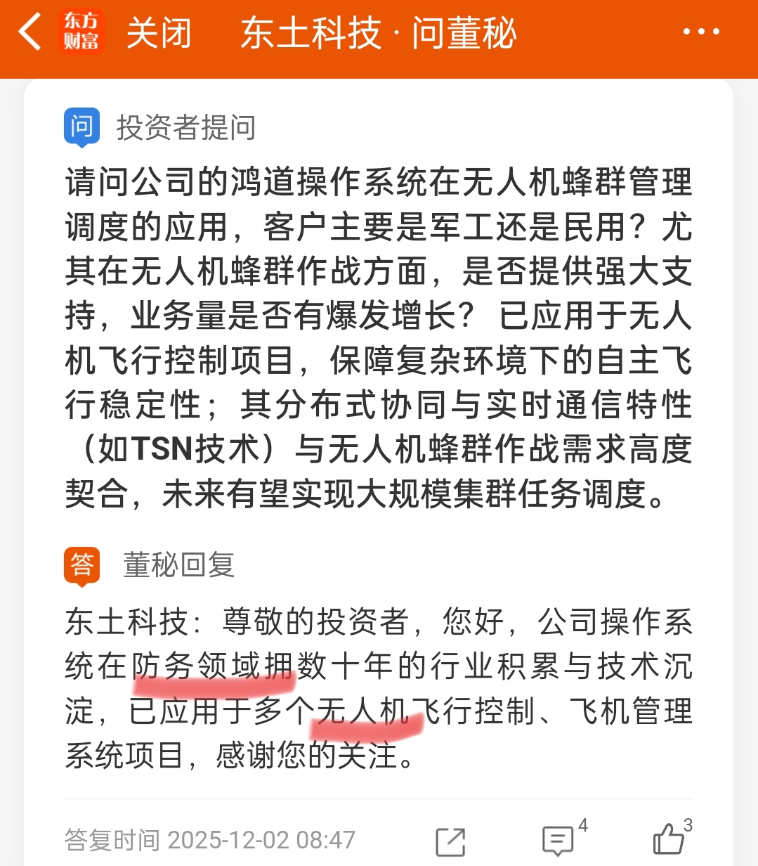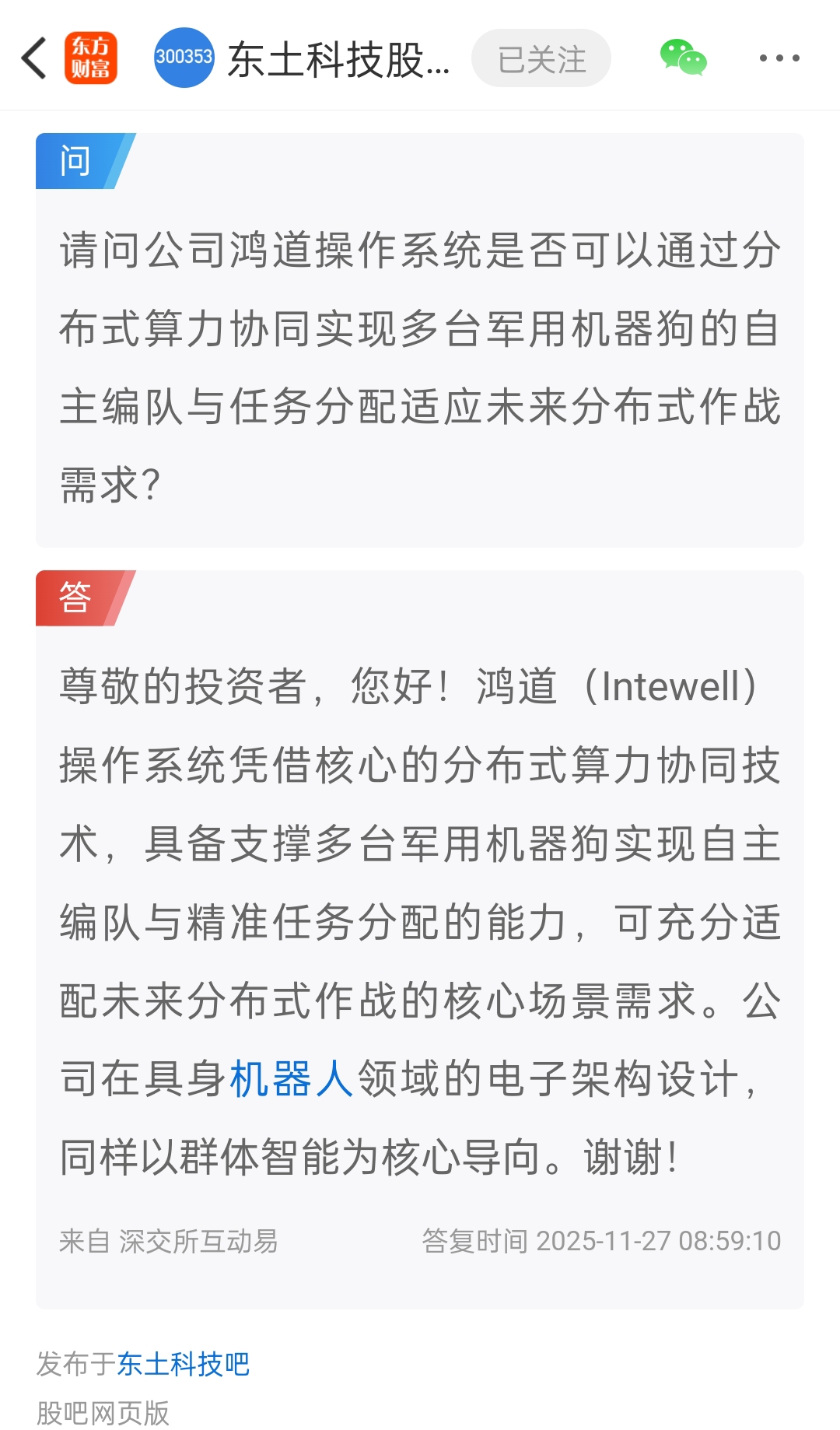 东土科技(300353)技术和产品用于百种军事装备,无人化、信息化、智能化、具身