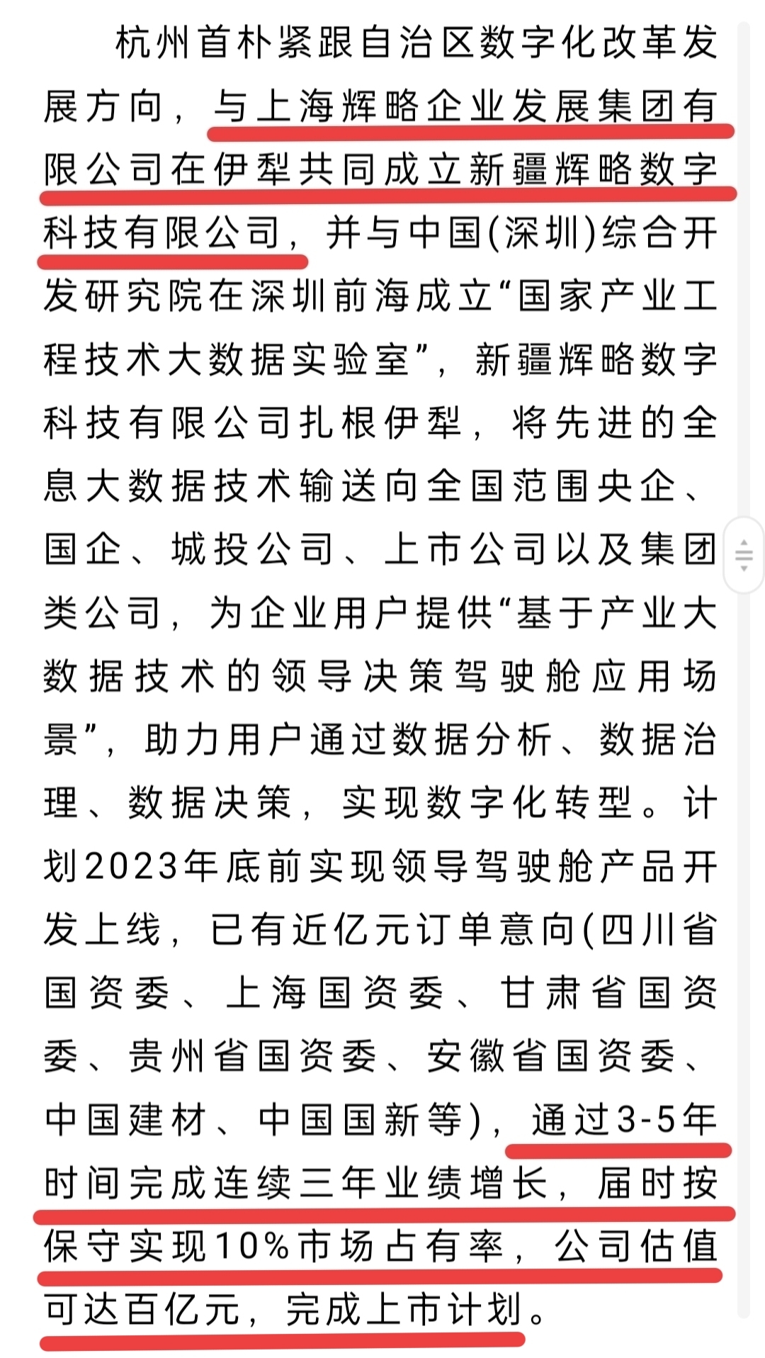 杭州首朴紧跟自治区数字化改革发展方向,与上海辉略企业发展集团有限公司在伊犁共同成立新疆辉略数字科技有限公司,并与中国(深圳)综合开发研究院在深圳前海成立“国家产业工程技术大数据实验室”,新疆辉略数字科技有限公司扎根伊犁,将先进的全息大数据技术输送向全国范围央企、国企、城投公司、上市公司以及集团类公司,为企业用户提供“基于产业大数据技术的领导决策驾驶舱应用场景”,助力用户通过数据分析、数据治理、数据决策,实现数字化转型。计划2023年底前实现领导驾驶舱产品开发上线,已有近亿元订单意向(四川省国资委、上海国资委、甘肃省国资委、贵州省国资委、安徽省国资委、中国建材、中国国新等),通过3-5年时间完成连续三年业绩增长,届时按保守实现10%市场占有率,公司估值可达百亿元,完成上市计划。”2023年8月18日在天山经济论坛上,杭州首朴投资管理有限公司总经理,迈迪信息技术有限公司董事长梁伟群作题为《投资新疆 深耕伊犁,助力伊犁州经济高质量发展》主题演讲。