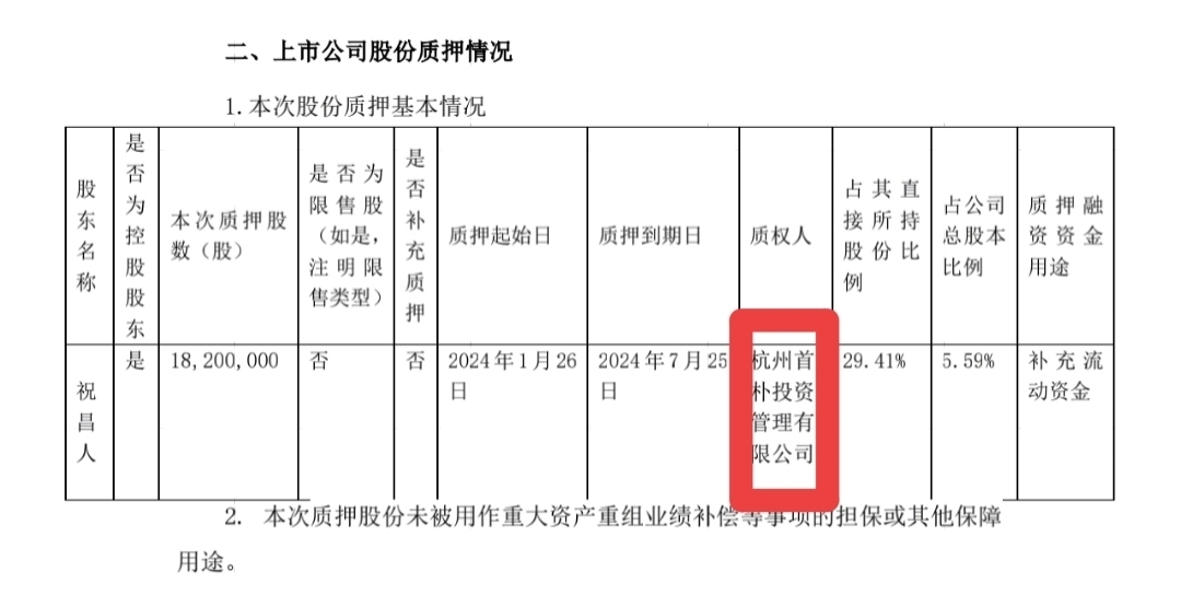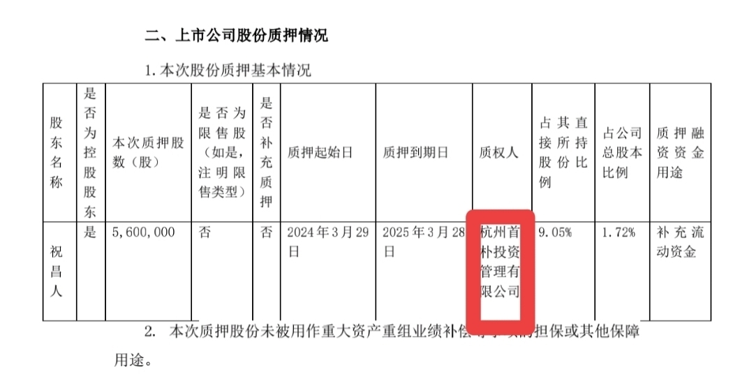 2024年3月29日,实控人祝昌人将其所持有的无限售流通股5,600,000股(占公司总股本1.72%)质押给杭州首朴投资管理有限公司,质押到期日为2025年3月28日。