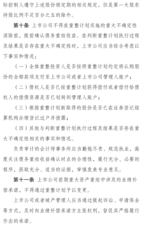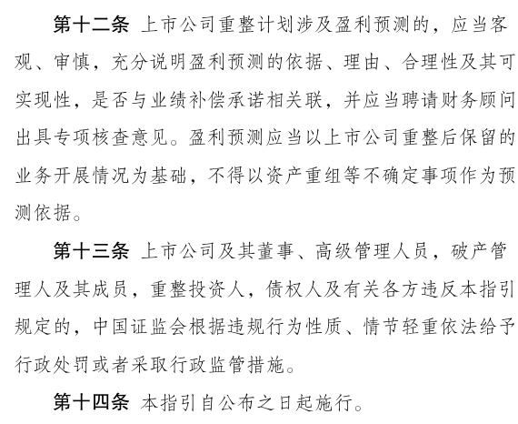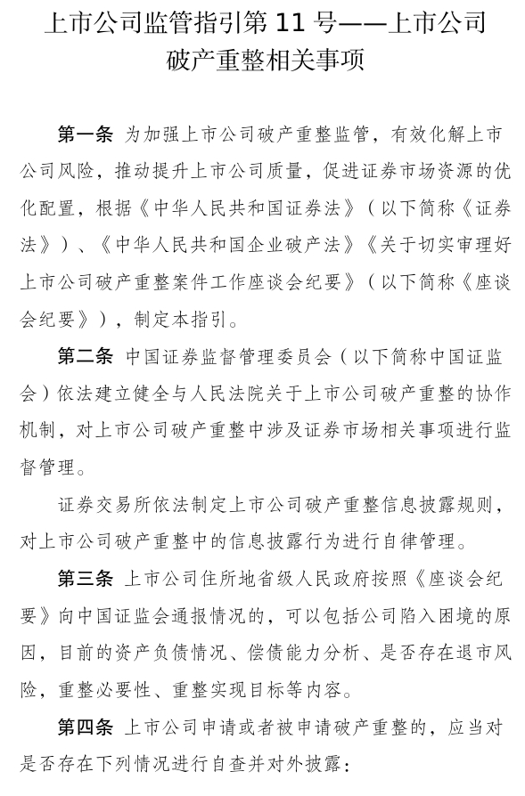2024年12月31日,最高法和证监会联合印发《关于切实审理好上市公司破产重整案件工作座谈会纪要》(法〔2024〕309号)。作为配套文件,证监会制定了《上市公司监管指引第11号——上市公司破产重整相关事项》(简称《指引》),自发布之日起实施。