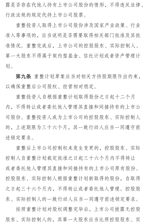 前期,证监会就《指引》向社会公开征求意见。从反馈情况看,各方总体认可《指引》,并结合实践提出了宝贵的意见和建议,涉及重整计划的披露要求、债务重组收益的确认依据、董事和高管人员保密责任等,经逐条研究,与《指引》条文有关的主要意见已采纳。后续,证监会将进一步加强政策解读,做好《指引》实施相关工作。