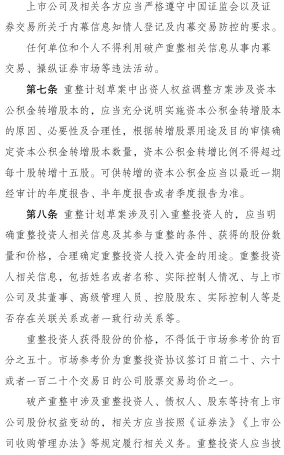 《指引》明确证监会对上市公司破产重整中涉及证券市场相关事项进行监督管理;证券交易所对上市公司破产重整中的信息披露进行自律管理。要求上市公司对是否存在退市风险、资金占用违规担保、信息披露或规范运作重大缺陷进行自查并披露。《指引》进一步明确重整计划中的权益调整要求,规定资本公积转增比例不得超过每十股转增十五股;重整投资人入股价格不得低于市场参考价的五折,市场参考价按重整投资协议签订日前二十、六十或一百二十个交易日均价之一确定;要求重整投资人按是否取得控制权分别锁定三十六个月、十二个月。同时,《指引》明确不得在重整计划实施的重大不确定性消除前,提前确认债务重组收益。