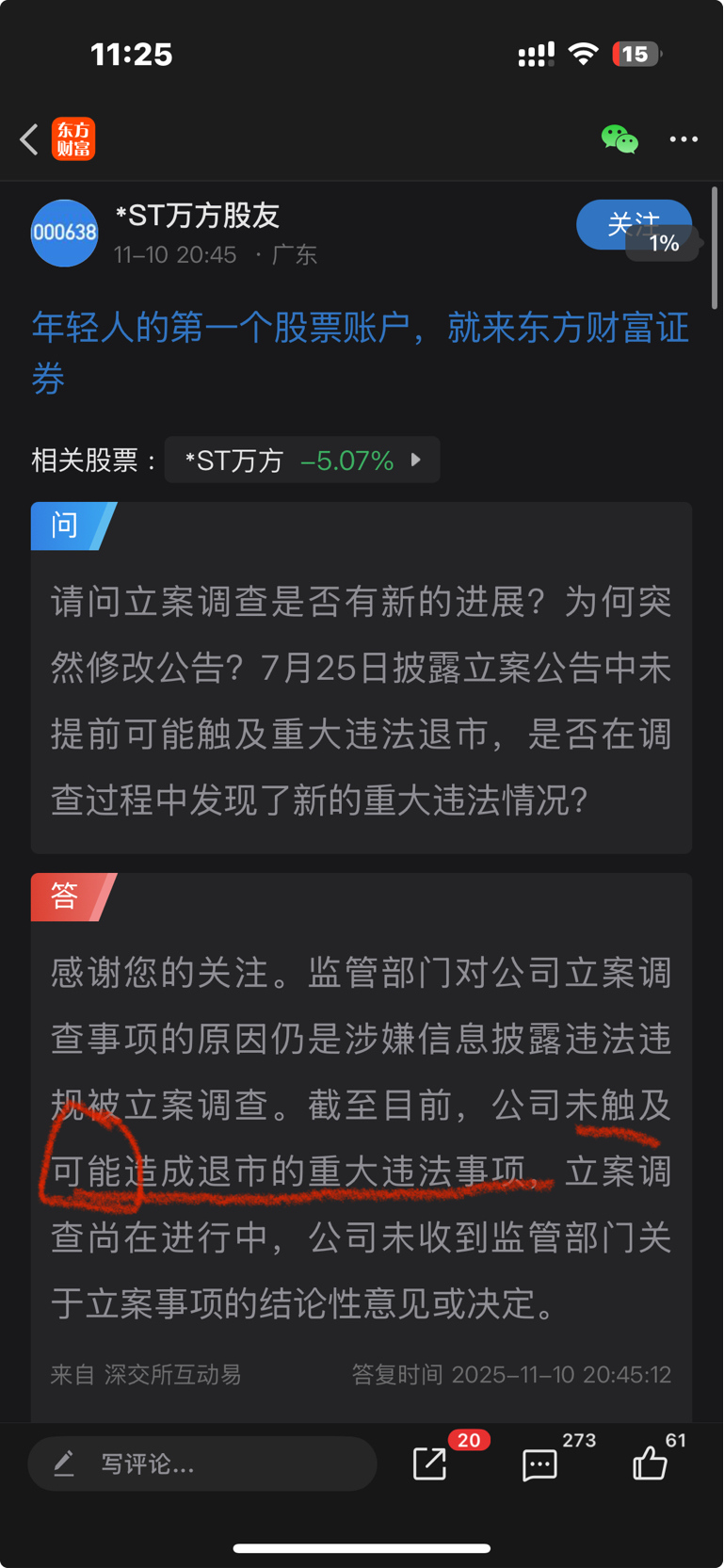 首先董秘已经排除当前触及违法退市的"可能",重点是可能这两个字,加不加的区别很大。
